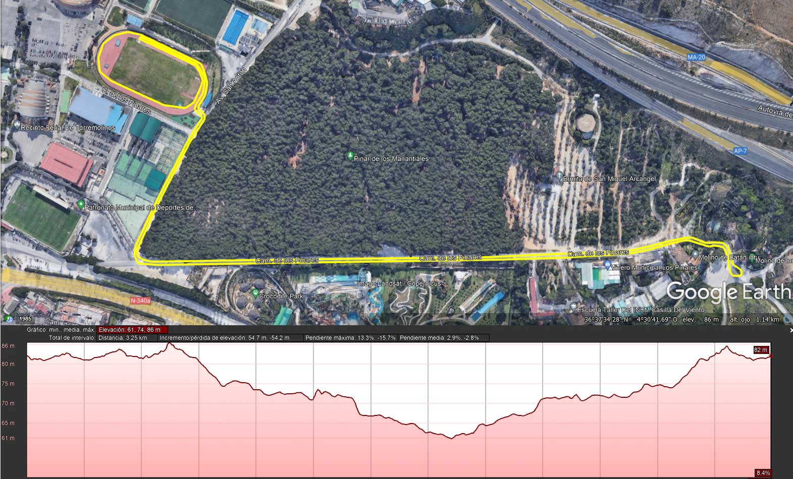 Se trata de una carrera popular con un recorrido de unos 8100 metros. Este recorrido será sólo para atletas inscritos/as en categorías desde juvenil a veteranos. La salida del recorrido es en la pista de atletismo y pasa por Avenida San Antón, C/Cuba, C/Costa Rica, C/Loma del Colegial, C/Sánchez Rando, C/Ecuador, Camino del Pozuelo, Avda. San Francisco, C/Pez Dorado, C/Loma de los Riscos, C/Ramos Puente, Avda. Joan Miró, Avda. Palma de Mallorca (a contravía), C/Casablanca, C/Danza Invisible, Avda. Palma de Mallorca, Plaza Costa del Sol, C/Cruz, C/Marqués de Salamanca, C/Conde Mieres, C/Campillos, C/Río Aranda, C/Río Bergantes, C/Costa Rica, 1º carril dirección Molino Inca, Carril de los Manantiales, Avda. San Antón, y META PISTA DE ATLETISMO 8100m.